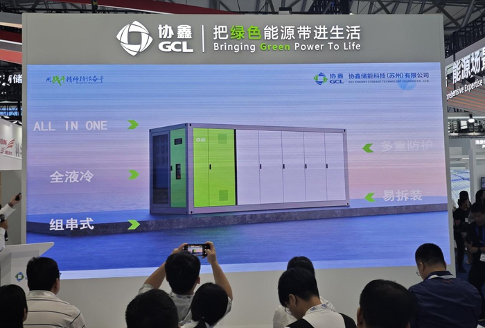展会首日,协鑫集团现场发布了“5MWh All-in-one 集装箱”储能系统,据工作人员介绍,该产品采用全液冷设计,能有效提高环境适应性和器件寿命;同时组串式设计能有效减少环流,提升系统整体效能约2%。