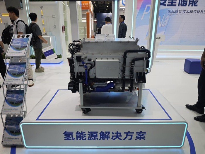 在展会走访期间,银柿财经注意到,相比各家企业重点展示的储能产品,氢能似乎稍显逊色。但在天能展台,一台氢燃料发动机吸引了不少观众驻足细看。