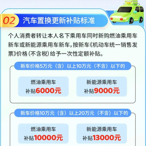 其中,新车价格5万元(含)以上10万元(不含)以下的,燃油乘用车补贴6000元、新能源乘用车补贴9000元;新车价格10万元(含)以上20万元(不含)以下的,燃油乘用车补贴10000元、新能源乘用车补贴13000元;新车价格20万元(含)以上的,燃油乘用车补贴15000元、新能源乘用车补贴18000元