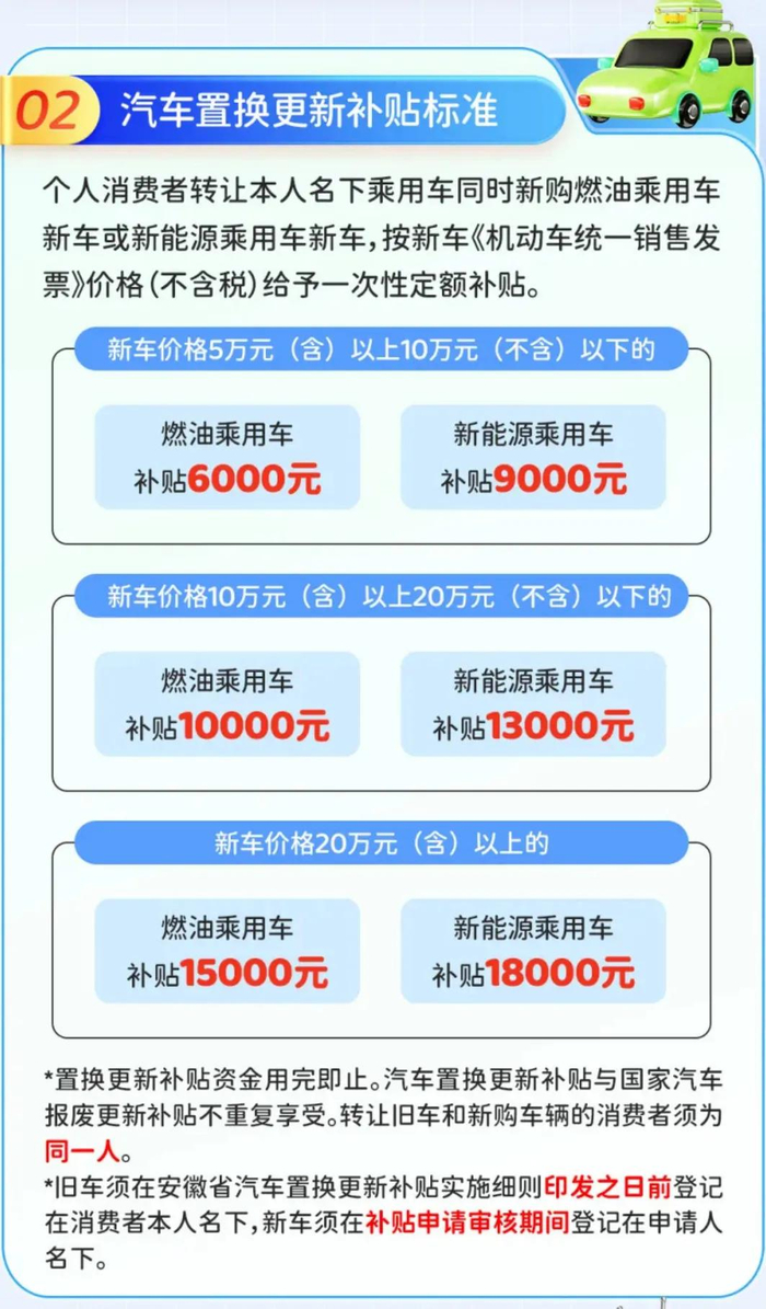 汽车置换更新方面,自《安徽省汽车置换更新补贴实施细则》细则印发之日(2024年9月7日,含当日,下同)至2024年12月31日期间,对个人消费者转让本人名下乘用车(以下简称“旧车”)同时新购燃油乘用车新车或新能源乘用车新车(以下简称“新车”)的,按新车《机动车统一销售发票》价格(不含税)给予一次性定额补贴。置换更新补贴资金用完即止。