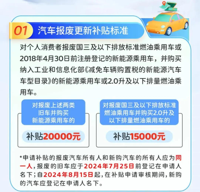 汽车报废更新方面,自2024年4月24日(含当日,下同)至2024年12月31日期间,对个人消费者报废国三及以下排放标准燃油乘用车或2018年4月30日前注册登记的新能源乘用车,并购买纳入工业和信息化部《减免车辆购置税的新能源汽车车型目录》的新能源乘用车或2.0升及以下排量燃油乘用车,给予一次性定额补贴。