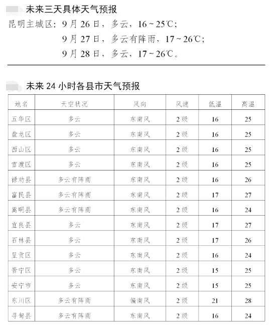 昭通市、曲靖市、文山州、红河州、昆明市、玉溪市、普洱市、西双版纳州、临沧市、德宏州、保山市、怒江州多云有阵雨局部中雨,其他地区多云间晴。