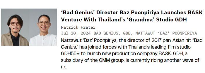 今年,GDH与《天才枪手》的导演纳塔吾·彭皮里亚联手,成立新的制作公司Bask,将以泰国和东亚文化为题材资源,面向全球发行与传播。据《综艺》等外媒报道,Bask正筹划与美国制片公司合作,寻找跨国制作的新模式。