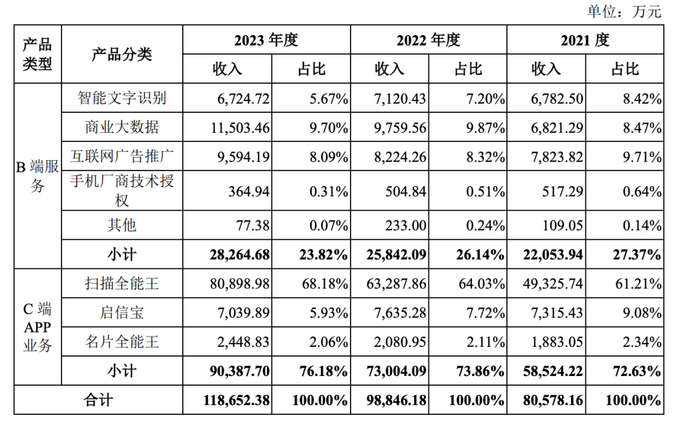 从营收结构来看,合合信息主要营收来源还是来自C端业务。2021年至2023年,公司C端收入分别为5.84亿元、7.3亿元和9.03亿元,占比分别为72.63%、73.86%和76.18%。其中,扫描全能王贡献了接近七成收入,是名副其实的现金奶牛。