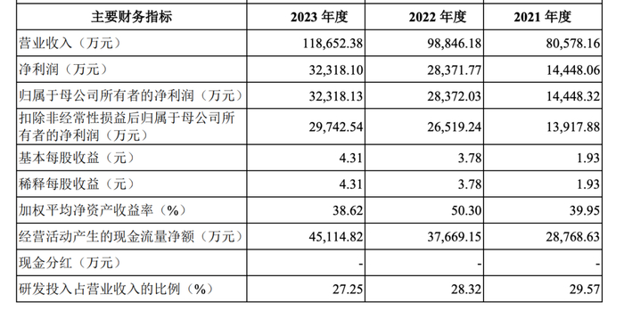 成色几何?招股书显示2021年至2023年,公司营业收入分别约为8.05亿元、9.88亿元、11.86亿元,对应净利润分别为1.44亿元、2.83亿元及3.23亿元。