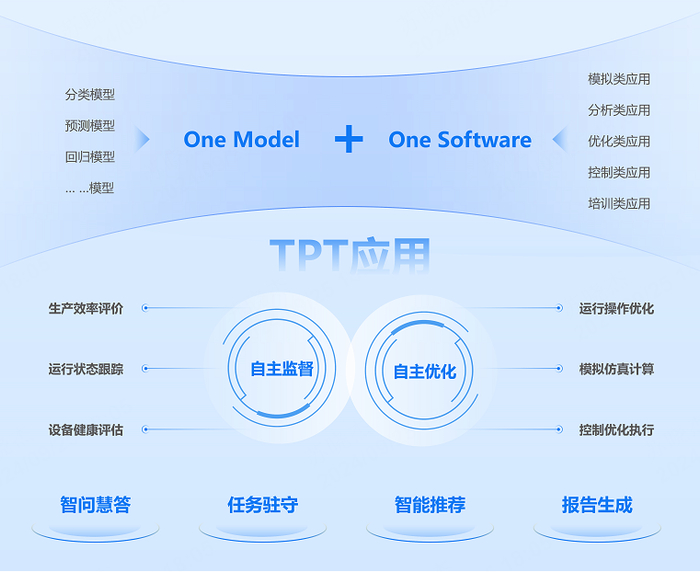 TPT是中控技术自主研发的基于生成式AI算法及海量工业数据训练而成的流程工业时序大模型。TPT通过统一分析类、优化类、控制类、培训类等工业建模过程,实现装置的跨工况、高精度、高可靠模拟与预测,从而解决数据碎片化、工业应用分散等难题,构建以一个模型为基座,打造一个软件支撑多种应用的新模式。