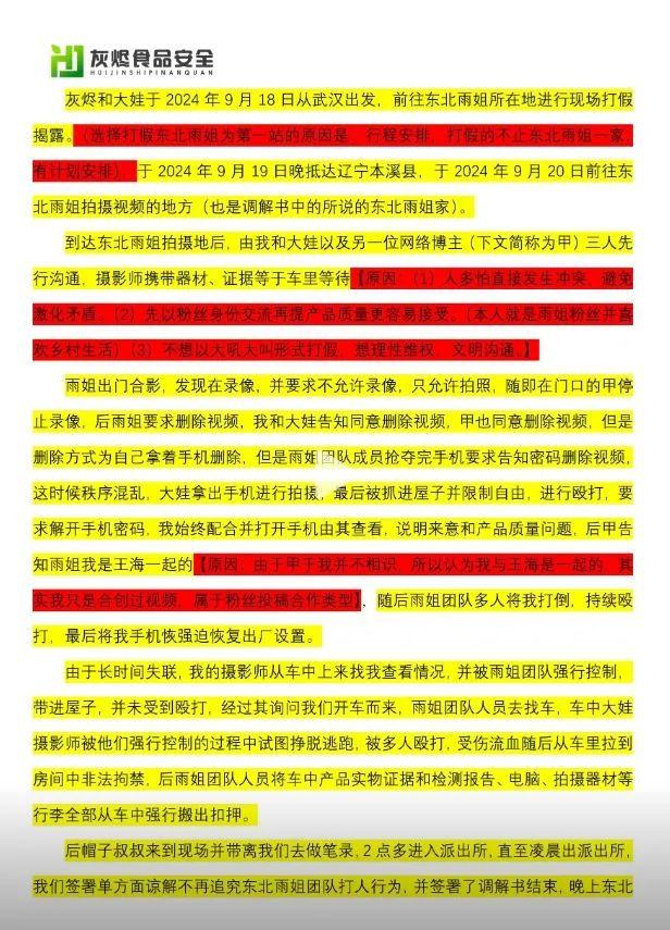 博主表示,9月20日团队上门找东北雨姐进行揭露,但沟通过程中产生冲突,被对方殴打和限制人身自由,并要求删除所拍摄的视频,后续在相关部门的调解下签署了谅解书,目前已离开当地。