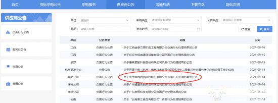 根据负面行为处理结果公告,中亦科技在参与上述项目时违反了《咪咕文化科技有限公司采购供应商负面行为管理办法》,根据的相关规定,在中国移动直属的咪咕公司采购范围内,对中亦科技计严重负面行为一次。