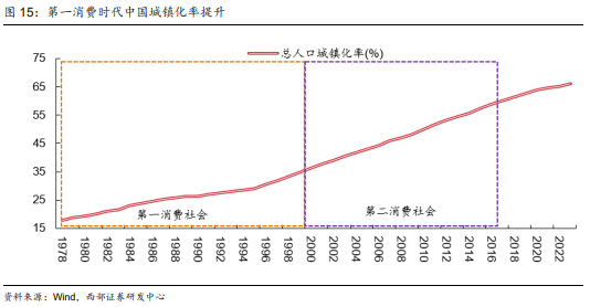 从城镇化的角度来看,1978年改革开放之初,我国总人口城镇化率为17.9%,接近日本1920年第一消费社会起点的18.0%。随着上世纪80年代我国城市经济体制改革陆续展开,我国城市化水平也显著提升,到2000年我国总人口城镇化率达到36.2%,接近日本1940年第一消费社会尾声37.7%的水平。
