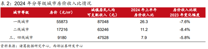 一、二线城市消费偏弱或源于房价下行导致高能级城市居民资产负债表受损更多。按照2023年社零体量加权,今年上半年一线城市社零同比增速为-0.67%,二线城市社零增速为3.36%。考虑到上半年全国社零同比增速为3.7%,一、二线城市的消费数据明显弱于三、四线城市。如前文所述,当前商品消费表现较为低迷的原因在于,居民资产负债表受损后会压缩其消费开支,且对商品消费的压缩程度大于服务消费。从房价跌幅来看,截至2024年8月,一线、二线城市二手房市场均价同比降幅分别为5.4%和8.9%,三四线城市同比降幅为5.1%。如果将房价收入比纳入考量,2024年上半年一、二线城市房价收入比分别为26.3和11.2,显著高于三、四线城市的7.9,这意味着尽管一线和三线城市的房价跌幅相近,但一线城市居民的资产相对于收入缩水的程度是三线城市的三倍以上,进而一线城市的消费表现更弱。