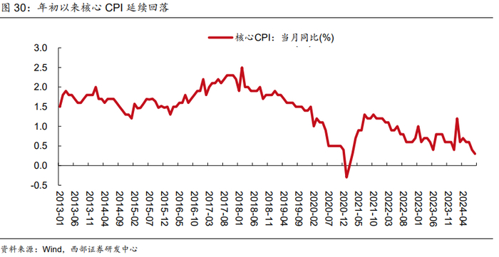 从消费的维度看,低价策略驱动供需两端共振,或加大通胀下行压力。从需求端看,由于房价下行导致居民部门资产负债表受损,进而消费者选择压缩商品消费支出,同时表现出对低价商品的偏好。从供给端看,如前文所述,当前中国处于第三消费社会中后期,从日本经验看采取低价策略的企业通常能够脱颖而出。考虑到当前中国实体投资回报率偏低,未来或有更多消费品企业参与低价竞争。这或将在供需两端给通胀带来下行压力,年初以来核心CPI的回落也印证上述观点。