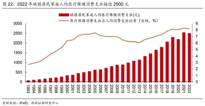 人口结构的变化也是中国第三消费社会不容忽视的特征,单身化、少子化、老龄化衍生出消费新需求。2013年我国结婚率见顶,此后持续处于下行区间,2022年我国结婚率录得4.8‰,达到历史最低水平。随着单身化趋势愈发明显,居民消费也由过去的“家庭化”走向“个人化”,小家电、速食食品、生鲜电商的市场规模迅速扩张。这一时期我国老龄化呈现加速趋势,65岁以上人口占比由2018年的11.5%增长至2022年的13.7%,进而催生出潜力巨大的银发经济需求。到2022年我国城镇家庭人均医疗消费支出达到2480.7元,占人均消费支出比重为8.2%,高于第二消费社会(2001-2017年)的整体水平。
