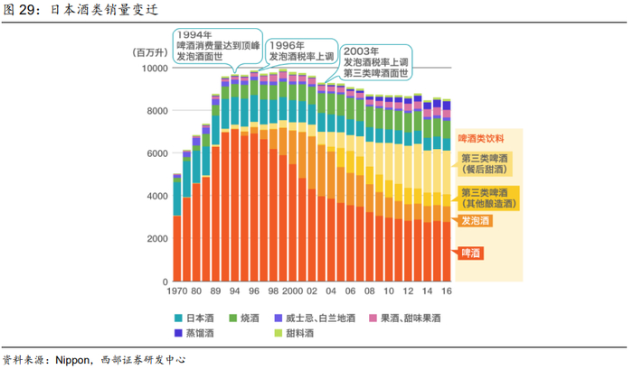此外,日本酒类消费的变迁也印证低价策略在第三消费中后期更具有优势。20世纪90年代初,日本酒税法将啤酒定义为麦芽比率在67%以上,并对其收取44.1%的酒税。为应对高税率,三得利公司1994年推出起泡酒,其味道和香气近似啤酒,但价格仅为普通啤酒价格的60%左右,进而快速占据市场份额。但随着日本政府不断调整起泡酒的税收政策,使得其逐渐丧失价格优势,市场份额也被酿造酒和餐后甜酒等价格更低的第三类啤酒挤压。
