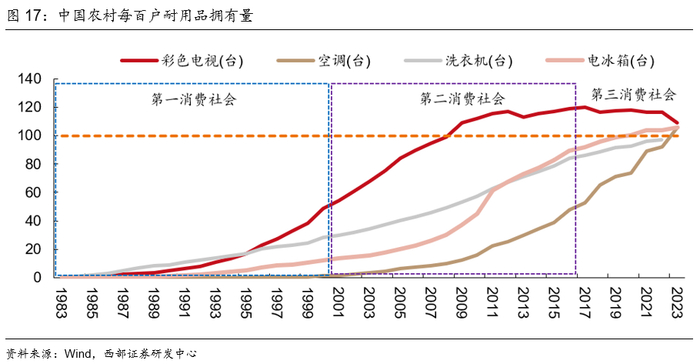 第二消费社会(2001-2017年):“入世”后“大量生产、大量消费”的时代。受益于中国加入WTO,这一时期中国的经济整体呈现高速增长态势,城镇化进入加速期,工业化水平显著提升,汽车、家电等产量迅速提高。同时,受益于取消农业税和家电下乡等政策,耐用消费品在农村广泛普及。