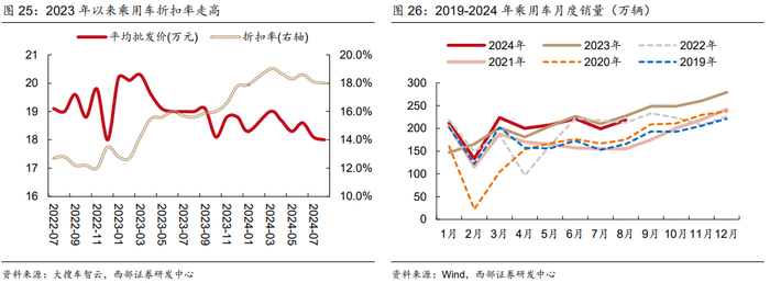 类似地,当前中国消费社会的许多现象也表明居民部门的消费意愿并不低,但由于房地产价格下行导致居民部门资产负债表受损,其消费能力出现萎缩。从服务消费的表现来看,2023年以来旅游消费持续火热,节假日出游人数显著增长,但人均旅游消费却有所回落。从汽车等耐用品消费来看,“以价换量”策略依然有效。2023年我国乘用车销量达到2606.3万辆,创下历史新高,但整车折扣率由2022年底的13.5%增加至2023年底的17.8%。今年以来,乘用车销量增长承压,一定程度上也源于年内整车折扣率的波动。从商品零售数据来看,今年以来社零增速下滑,其中服饰、汽车等耐用品零售额增速回落较快,食饮烟酒零售额仍有支撑,这与1991-1994年的日本较为类似。