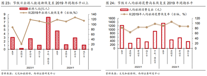 2023年以来,中国的消费社会开始出现与此前截然不同的趋势,部分观点认为中国已开始进入低欲望的第四消费时代。从统计数据来看,今年上半年我国社零同比增速为3.7%,较往年有所回落,北京、上海、广州、深圳的社零同比增速分别为-0.3%、-2.3%、0.0%和1.0%,均低于全国整体水平。根据《2024中国消费趋势报告》中的调查,56%的消费者表示只买自己需要的和必要的商品,32.5%的消费者会在比较贵的产品上寻找平价替代品,甚至有13.2%的消费者选择购买二手商品。尽管商品消费表现平淡,但旅游市场却持续升温,“演唱会经济”也成为部分地方经济复苏的动力之一。据中国演出行业协会数据,2023年全国演出票房收入502.3亿元(不含农村演出和娱乐场所演出),较2019年增长150.7%;观演人数超1.7亿人,较2019年增长83.0%。