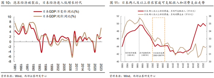 我们认为当前中国的消费社会更类似于日本1991-1996年的处境,即处于第三消费社会的中后期。1991年日本泡沫经济破裂后,日本商品零售额同比增速明显下滑。但受日本政府出台的一系列金融和财政政策提振,日本经济在1995年开始回暖,商业零售额和家庭消费支出增速再度回升。因此,日本消费表现在这一时期较为低迷的原因在于,资产负债表衰退导致居民部门的消费能力下降,而非消费倾向的转变。