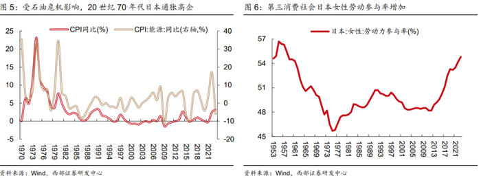 第一次石油危机后,日本经济进入中低速增长期,女性劳动参与率底部回升。受1973年石油危机影响,日本经济增速开始放缓。1974年日本名义GDP增速为19.3%,而实际GDP却出现负增长,增速仅为-1.2%,这表明当时日本正在经历能源价格上涨带来的高通胀。1974年日本CPI同比增速高达23.2%,其中能源CPI同比达到33.1%。此后,日本进入中低经济增速时期,1974-1990年名义和实际GDP年均复合增速分别为7.7%和4.5%。在过去日本经济高速增长期,日本女性“专职家庭主妇化”较为普遍,女性劳动参与率显著回落。在第三消费时代,日本女性为弥补家庭收入的下滑,重新回到劳动力市场,女性劳动参与率再度提高,从事临时工的女性显著增加。
