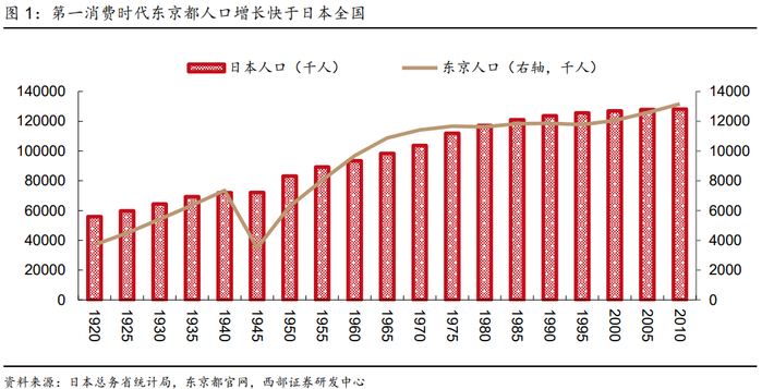 日本的第一消费社会始于20世纪初期,得益于技术进步和城市化进程,日本涌现出许多消费品,在城市地区出现了消费繁荣。由于日本政府在明治维新时期实施一系列政治经济改革,日本在30年左右的时间内就完成了欧美各国历经半世纪的产业革命,这也是近代意义上日本消费社会的开端,即日本企业开始拥有批量生产的能力。在第一消费时代,日本的总人口规模保持较快增长,并向大城市流动,城市化进程加快。1940年日本东京都人口达到735万人,较1920年接近翻倍增长,同期日本总人口仅增长28.5%。人口的持续流入使得日本城市地区的消费能力持续增长,伴随着西式商业社会在日本逐渐形成以及企业批量生产能力的提升,日本诞生了电灯、缝纫机、收音机、百货公司、写字楼、公寓等新型消费品或消费业态,出现了近代意义上首次消费繁荣。但由于当时的消费品以手工生产为主,价格相对高昂,不利于推广,因此日本的第一消费社会是以城市为中心、由少数中等资产阶级享受的消费。