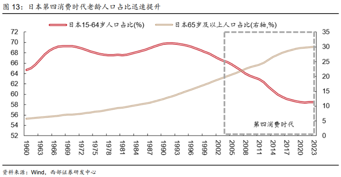 第四消费社会:经济增速偏低,城镇化率缓慢提升,社会消费处于“低欲望”时代。从人口特征看,这一时期人口老龄化程度进一步加深,劳动年龄人口占比快速下降,整体处于超老龄化社会。