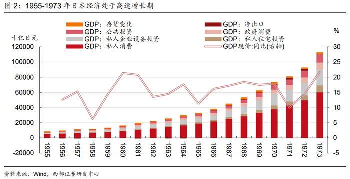 日本的第二消费社会与经济高速发展期重合,由于社会生产力显著提升,以家用电器为代表的批量生产商品开始在全国范围内普及。1946-1954年,日本进行了一系列财政金融改革,实施“倾斜生产方式”的产业政策,使经济很快恢复到战前水平。这一期间日本的国民生产总值年均增长率达9.2%,被称为“战后复兴期”。1955年日本进入经济高速增长时期,直到1973年在石油危机的冲击下,由高速增长转向中低速增长的转型时期。在此期间,日本完成工业化,迈入发达国家行列,名义GDP年均增速达到15.5%。与此同时,日本人口进一步向城市聚集,城镇化率由1945年的27.8%提升至1973年的74.2%,越来越多的日本居民从贫困状态中脱离,开始享受更多的消费机会。由于在此阶段日本的近代工业化得以真正发展,洗衣机、电冰箱、电视机等批量生产商品在日本开始普及,日本民众的消费观念也开始转变。