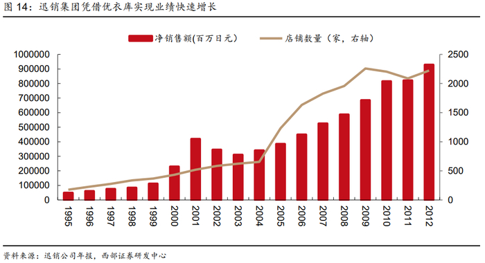 当前中国正处于第三消费社会的中后期,从日本经验看,这一时期脱颖而出的消费企业多数采取低价策略。日本两人以上家庭月度服装支出于1991年见顶,此后持续回落,日本家庭服装支出占消费支出比例由1991年的3.0%回落至2004年的1.7%。1991-1998年,优衣库凭借大众化定位和平价特征抓住消费趋势变化带来的红利,在日本实现门店数量的快速扩张。1998年优衣库推出明星单品——摇粒绒,此举打破了户外品牌的垄断,也使得摇粒绒的价格由1万日元降至1900日元。摇粒绒的成功使得优衣库业绩迅速增长,带动迅销集团股价由1999年初的171.4日元/股快速上涨,到2000年11月达到年内高点5300日元/股。