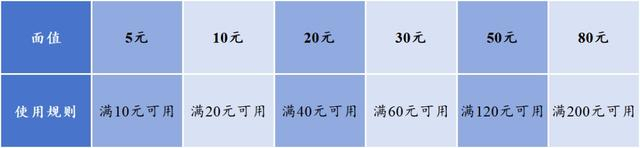 (一)券面规则。共推出四种面额。一是50元面额,餐饮消费满300元每次抵用一张;二是100元面额,餐饮消费满500元每次抵用一张;三是200元面额,餐饮消费满800元每次抵用一张;四是300元面额,餐饮消费满1000元每次抵用一张。