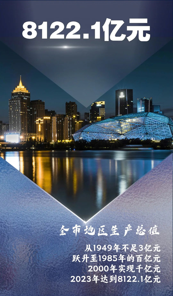 沈阳地区生产总值1949年不足3亿元,经过不懈奋斗,1978年达到43.6亿元,并在1985年超百亿、2000年超千亿、2014年跃上5千亿台阶。2023年为8122.1亿元,是1978年的186.3倍、新中国成立初期的3000余倍。