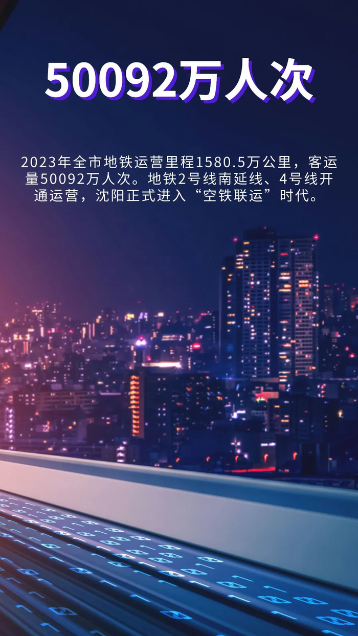 75年来,沈阳城市基础设施从薄弱走向完善,城市发展格局全面升级,城市空间清朗有序。2023年,全市道路长度达到5827公里,桥梁542座,排水管道7546公里,分别是1978年的5.7倍、6.4倍和6.3倍。地铁运营线路5条,线网运营里程达到159.6公里,比2010年第1条地铁线路一号线开通时增长近5倍,全年运营里程1580.5万列公里,客运量50092万人次,地铁2号线南延线、4号线开通运营,沈阳正式进入“空铁联运”时代。