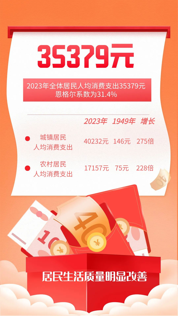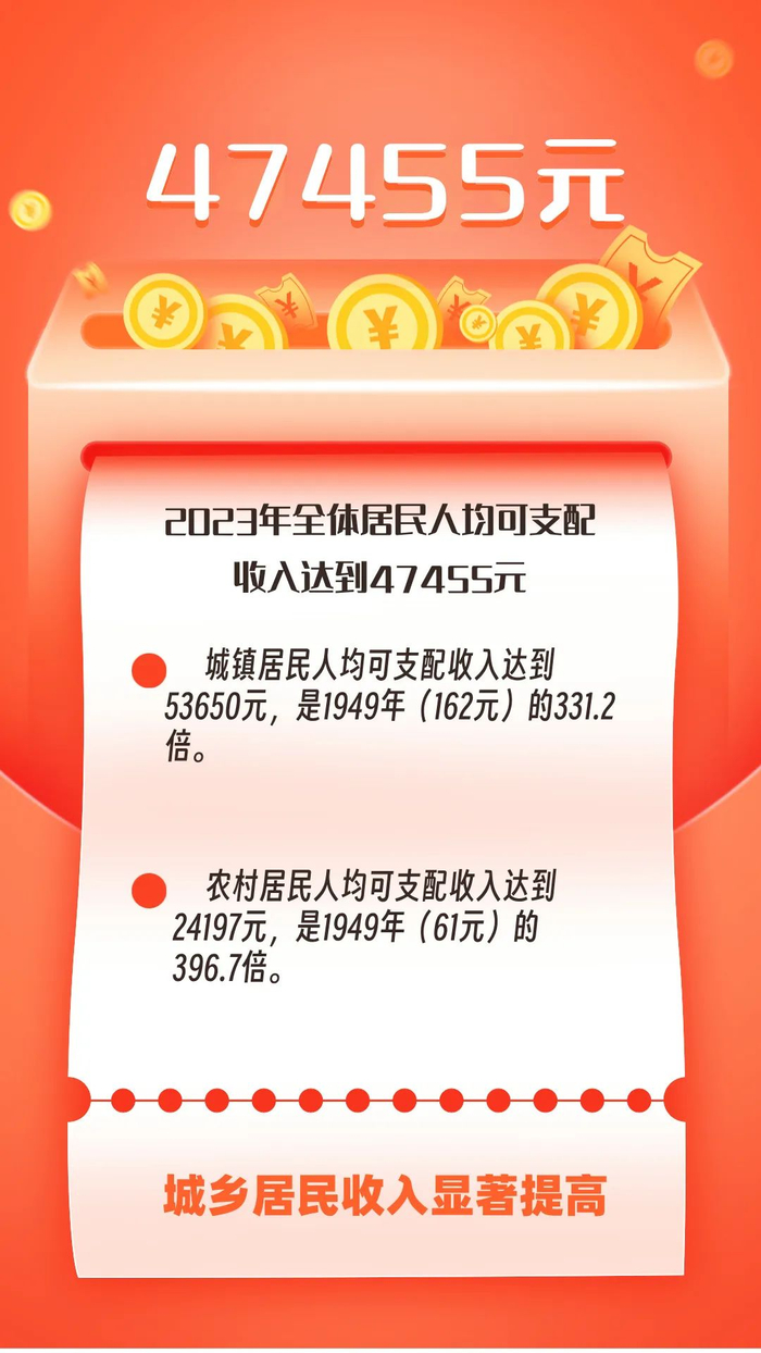城乡居民收入显著提高。2023年,城镇居民人均可支配收入53650元,是1978年的157.3倍、1949年的331.2倍;农村居民人均可支配收入24197元,是1978年的175.3倍、1949年的396.7倍。人均住户存款由1978年的59元提高到2023年的15.2万元。