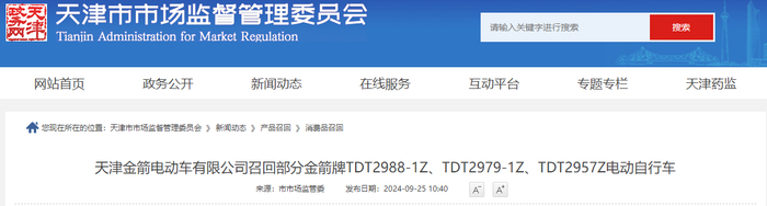 天津金箭电动车有限公司召回部分金箭牌TDT2988-1Z、TDT2979-1Z、TDT2957Z电动自行车
