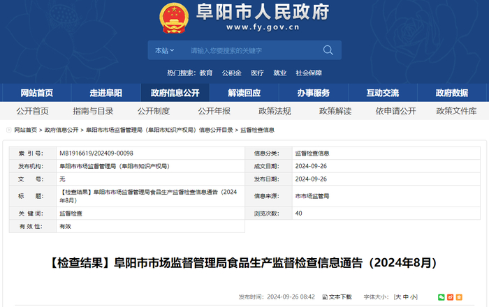 【检查结果】安徽省阜阳市市场监督管理局食品生产监督检查信息通告(2024年8月)