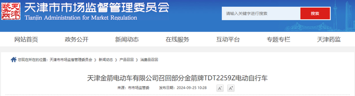 天津金箭电动车有限公司召回部分金箭牌TDT2259Z电动自行车