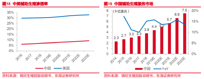 辅助生殖需求持续增长,市场空间广阔。由于首次生育平均年龄上升、不健康生活方式以及环境因素所致,不孕症愈发普遍,我国辅助生殖服务市场持续快速增长。2021年7月20日,国务院发布了《关于优化生育政策促进人口长期均衡发展的决定》,进一步落实三孩生育配套政策,规范人类辅助生殖技术应用,强化规划引领,严格技术审批,建设供需平衡、布局合理的人类辅助生殖技术服务体系,鼓励生育逐渐成为我国的基本政策。根据弗若斯特沙利文预测,2023年我国不孕症患病率预计为18.2%,辅助生殖服务市场预计达到75亿美元,渗透率预计为9.2%。伴随二孩、三孩政策持续推进,我国辅助生殖渗透率有望持续提升,市场空间广阔。