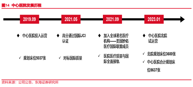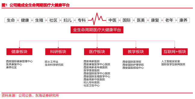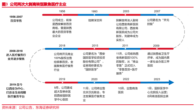 第三阶段:聚焦西安医疗行业。2019年9月,公司建成超大型单体医院西安国际医学中心医院。2020年11月,公司出售北京汉氏联合生物技术,为公司专注发展医疗服务主业提供资金支持。2022年10月,公司出售商洛国际医学中心医院,专注以西安为中心打造全生命周期医疗健康服务平台。2023年1月,国际医学中心医院北院试运营。目前,国际医学运营西安高新医院、西安国际医学中心医院、西安国际医学中心医院北院区等大型综合性医疗机构,探索发展“综合医疗+特色专科”创新模式,打造行业领先的提供全生命周期医疗健康服务的健康管理集团。