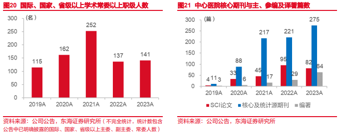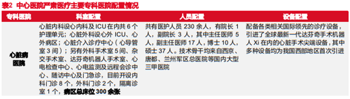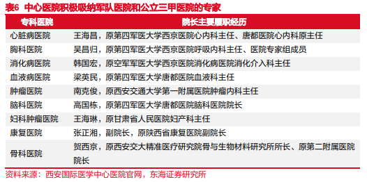 汇聚西北地区优势医疗人才资源,为医院发展提供强力支持。1)军改东风吹起,助力专家荟集:2018年,《关于军队和武警部队全面停止有偿服务活动的通知》及《关于深入推进军队全面停止有偿服务工作的指导意见》两部文件发布,明确将全面停止一切军队有偿服务项目,对于国家赋予的医疗、科研等社会保障任务,以及国家指令性任务,纳入军民融合发展体系。2019年建院之初,中心医院便已广纳贤才,积极吸纳军队医院和公立三甲医院的国内名医、三级以上教授、国家突出贡献的中青年专家及享受政府特殊津贴专家,拥有各学科带头人为核心的人才队伍,人才优势突出。其中,从知名三甲医院、部队医院引进的占85%。2)持续丰富人才储备。经过四年多的运营及扩充,中心医院医生系列中具有高级技术职称的人员占23%,硕士、博士学历人员已经超过50%,硕、博研究生导师100余人,国家级、省级以上各专业学会中现(曾)担任主委、副主委、常委500余人次。当前,中心医院汇聚了众多三甲医院各学科领域领军或优秀人才,为中心医院的发展提供强有力的支撑。