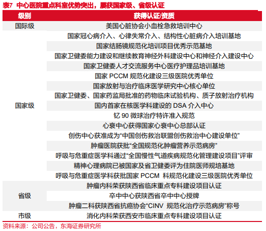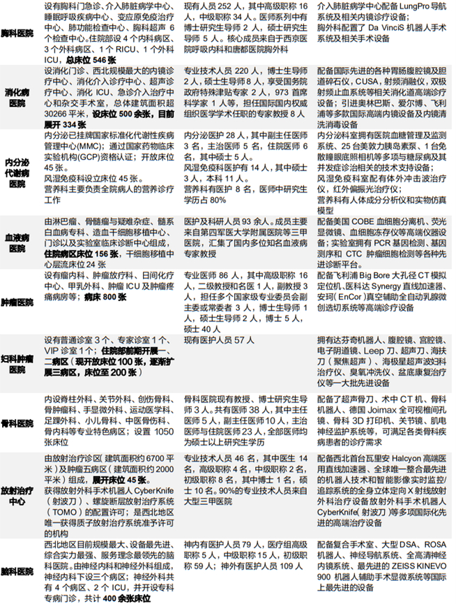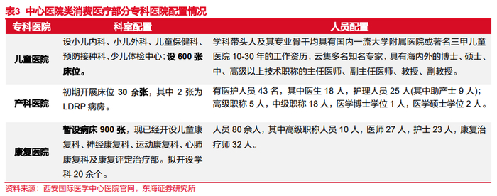 中心医院:发展进入快车道。中心医院是按照三甲标准建成的国内超大型单体综合医院,床位合计8637张。1.全科医疗并举,患者粘性持续提升。拥有二十大专科医院,覆盖严肃医疗、类消费医疗及IVF、质子中心等资质稀缺的特色专科,可服务全生命周期,患者粘性有望持续提升。2.专家荟集,重点专科优势突出。2023年拥有省级以上学术常委以上职称的专家140余人,各学科带头人才资历优秀,重点专科优势突出,多个学科为国家、省、市级的重点和优势专科;发表SCI等核心期刊400余篇,医教研协同发展。3.同步国际一流的诊疗设备。中心建院之初便已申报设备引进计划230份,完成6000余台(套)设备引进、安装及调试工作,引进设备总价值约10亿元;其中多台设备为国际领先、西北首台等。4.荣获认证接轨国际。中心医院医疗质量与国际全面接轨,2021年5月,西安国际中心医院高分通过国际JCI认证;同年12月,加入妙佑医疗国际联盟。当前,中心医院三甲评审稳步推进。5.区域优势显著。西安为省内医疗资源高地,拥有三甲医院数量过半;高新区科技经济实力雄厚,前景可期。从床位及收入体量来看,中心医院龙头地位确立,且位于高新发展片区,诊疗增量可期。6.诊疗量进入新高度,盈利时代将至,中长期收入端有望迈入百亿规模。从月平均诊疗量来看,2024年3月平均日在院患者3611人;6月床位使用已达3500-3600张;至2024Q1外地患者占比39%。诊疗量持续攀升,规模效应下预计年内有望实现季度扭亏;中长期来看,中心医院有望向百亿级别收入规模迈进。