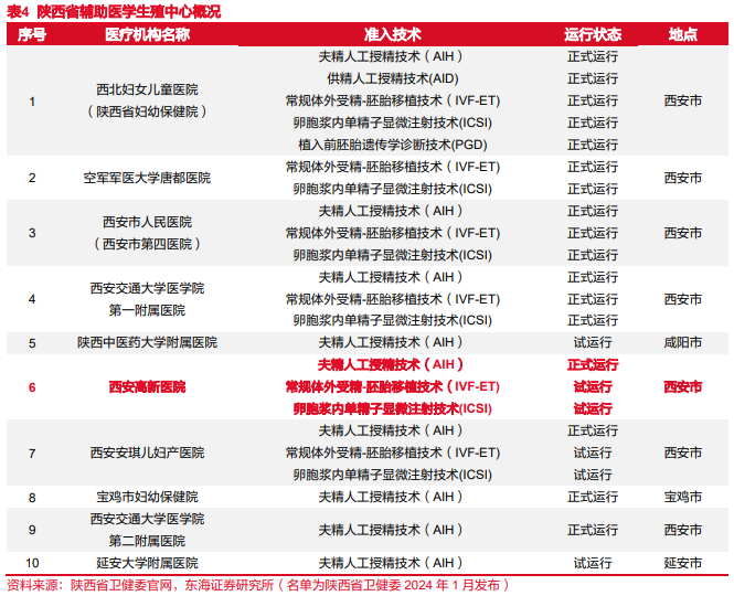 IVF资质稀缺,准入门槛高,公司特色专科医疗布局再下一城。我国的辅助生殖服务市场受严格监管,辅助生殖服务提供者必须分别获得AID、AIH、常规IVF-ET、透过ICSI进行IVF及PGD/PGS的五类批准证书。该等证书通常相继地发出,先获发AIH等证书,执业若干年后方获发透过ICSI进行IVF等较复杂的证书。如服务提供商未能通过政府审批机构定期进行的验证程序,证书或会被撤销。截至2024年1月,陕西省共有10家辅助生殖医学机构,7家在西安,6家医疗机构具备IVF执业资格。公司辅助生殖医学项目获批开展常规体外受精胚胎移植及卵胞浆内单精子显微注射技术(IVF/ICSI-ET),该中心具备每年4万例IVF周期运行能力,将成为国内规模最大的生殖医学中心之一。据《陕西省卫健委办公室关于印发陕西省人类辅助生殖技术配置规划(2021-2025年)的通知》中披露,将规划新增10所辅助生殖机构。到2025年,全省辅助生殖机构总量不超过20所(不包括人类精子库),辅助生殖整体牌照依旧稀缺。