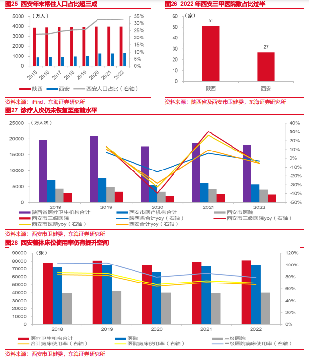 西安为陕西医疗资源高地,常态化运营下患者就诊意愿有望良性增长。从陕西省与西安最新的公布数据来看,2022年陕西人口为3956万人,西安人口达到1300万人,占比达33%。省内三甲医院有51家,其中西安有27家,医疗资源强势地位明显。从目前诊疗人次与床位使用率来看,西安尚未恢复至疫前水平,其中三级医院床位使用率从疫前的超负荷运营降至78.9%。我们认为,整体就诊量尚未恢复至疫情前水平主要是受多方面因素影响:1)疫情影响导致部分患者择期就医;2)疫情期间群众健康意识提升;3)宏观环境下部分医疗消费需求受到压制。整体来看,常态化运营下,西安有望凭借经济环境及省内医疗高地优势持续吸引省内名医及患者前往。