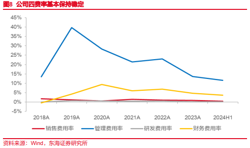 规模效应显现,费用率持续下降。2023年,公司销售、管理、研发、财务费用率分别为0.90%、13.60%、0.21%、4.66%,分别下降0.11、9.45、0.36、2.29个百分点;2024H1,公司销售、管理、研发、财务费用率分别为0.47%、11.52%、0.16%、3.66%,分别下降0.18、1.56、0.16、1.37个百分点。费用率均呈下降态势,规模效应持续体现。