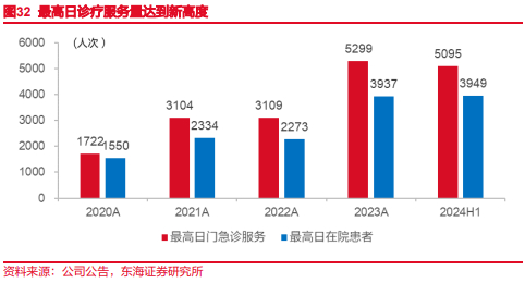 高新医院扩建以来诊疗量快速增长,床位再次进入满负荷运营状态。剔除2022年受停诊因素影响,2019-2021年期间,高新医院年均门急诊量为99.66万人次;2023年医院逐步恢复常态化运营,门急诊量迅速回升至115.11万人次,创历史新高。住院量方面,高新医院在2017年日均在院患者已突破1000人次,超过核定床位数808张,已超负荷运营;2020年底新住院楼投入使用,2019-2021年住院量从2.53万人次增长至5.01万日次,复合增速为40.72%。2023年住院量快速增长至6.46万人次,同比增速为56.0%;最高日门急诊服务量4952人次;最高日在院患者1865人,已超过规划床位数1500张,预期常态运营下,高新医院将维持满负荷运营状态。