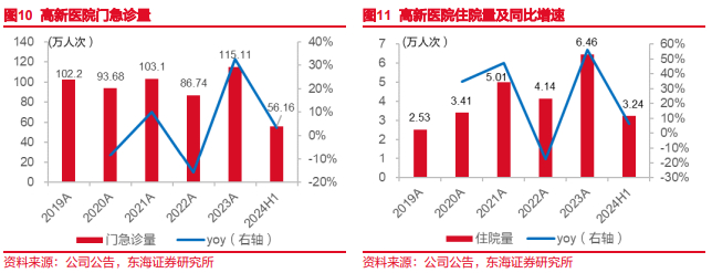 3)常态运营下,收入端稳健增长,盈利能力仍有显著提升空间。2023年起,高新医院恢复常态运营,收入快速增长至14.85亿元(YoY+50.48%);归母净利润增长至0.70亿元;净利率为4.69%。2024H1高新医院盈利能力进一步提升,实现收入7.72亿元(YoY+8.69%);归母净利润增长至0.49亿元;净利率为6.40%。预计高新医院诊疗量将维持满负荷运营状态,考虑到运营效率仍有提升空间,净利率有望逐步提升至新院投入前水平。
