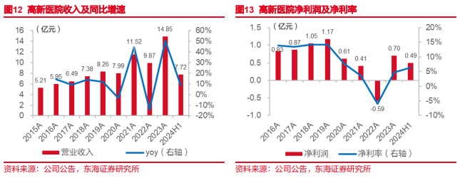 1、高新医院:纵观过往满负荷运营下仍能维持较快速增长,新院区投入前数年间净利率均值可达到14%。预计2024年起将维持满负荷运营状态,随后收入端维持稳健增长,盈利能力持续提升。