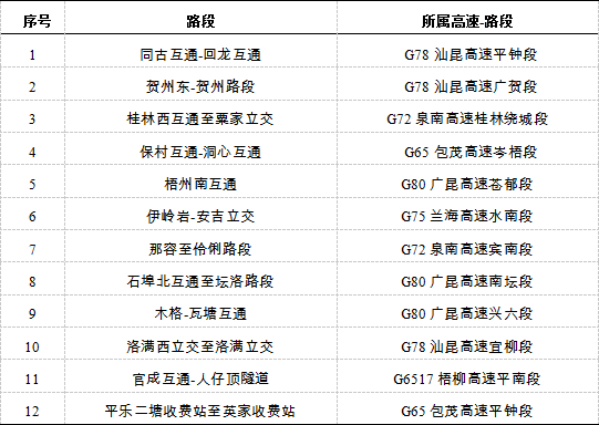 预计有G78汕昆高速平钟段同古互通-回龙互通、G72泉南高速桂林西互通等12个路段可能会出现交通拥堵。