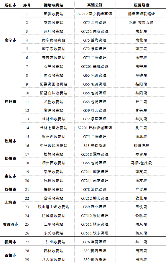 预计有南宁东、安吉、合浦、三江北、阳朔高田等29个收费站可能会出现交通拥堵。主要分布在南宁、北海、柳州、桂林等城市。