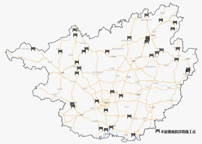 有G75兰海高速南宁至北海段钦江大桥改造重建等36处涉路施工点不能撤离,易因通行能力下降导致拥堵。中秋、国庆期间,原则上不允许施工,紧急抢修危及行车安全的设施或严重路面病害的除外,抢修路段请看链接:http://221.7.196.191:9002/gxgscx-public/#/home/homePage(广西高速公路出行信息服务网)