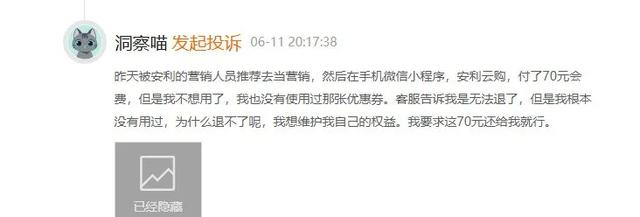首先,需要聚焦于安利直销员交纳的入门费问题。据黑猫投诉平台曝光,想要成为安利的直销员,必须在安利云购平台上交纳70元的会费。这笔费用不可退还,且仅赠送一张满600减70的优惠券。更令人咋舌的是,一年之后如果不续约,优惠顾客卡将自动作废。安利打了一手好算盘,既收取了费用,又通过优惠券的形式给直销员设下消费陷阱。