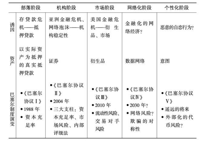 当我们把自1971年布雷顿森林体系结束以来的所有金融危机,以及每次危机后为应对这些危机而颁布的 《巴塞尔协议》 排列在一 起时,可以看出一种趋势。我概述了这一趋势:伴随着每一次危机发生,相关资产变得越来越无形。巴塞尔体系在1984年美国住房贷款危机后颁布的第一批规则,被简称为《巴塞尔协议I》。自那以后,在2004年实施了《巴塞尔协议II》,在2010年实施了《巴塞尔协议III》。我概述了每一次危机的性质、 所涉及资产的构成,并根据我们对过去流行趋势的观察,推断出在个性化阶段应对危机所需制定的监管框架。