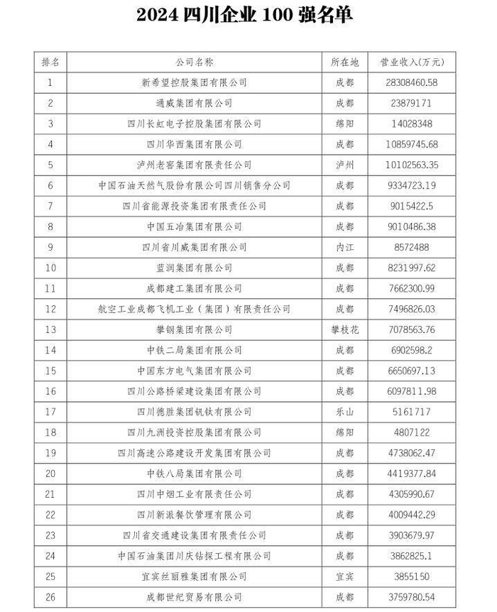 9月26日,2024四川大企业大集团发展大会在成都举行,会上发布了2024四川企业100强、四川制造业企业100强、四川服务业企业100强、四川数字经济企业100强四个榜单。