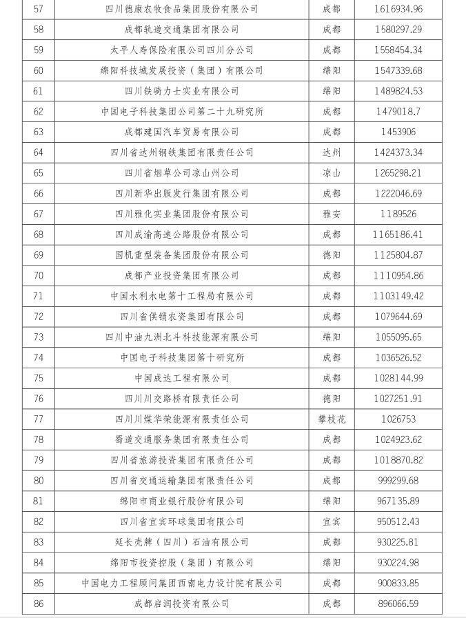 榜单显示,营业收入超过1000亿元的企业达5家,其中新希望控股集团有限公司、通威集团有限公司的营收超过2000亿元,四川长虹电子控股集团有限公司、四川华西集团有限公司、泸州老窖集团有限责任公司的营收超过1000亿元。
